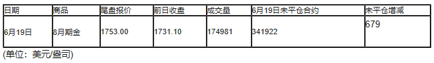 截至北京时间04:59,6月19日纽约商品交易所(COX)8月期金成交量为174981,6月19日未平仓合约增加679手。