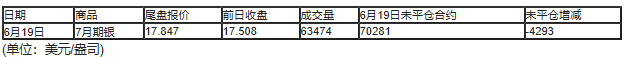 截至北京时间04:59,6月19日纽约商品交易所(COX)2020年7月期银成交量为63474,6月19日未平仓合约减少4293手。