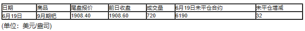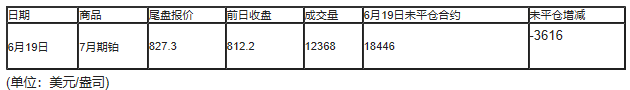 截至北京时间04:59,6月19日纽约商品交易所(NYX)2020年8月期铂成交量为12368,6月19日未平仓合约减少3616手。