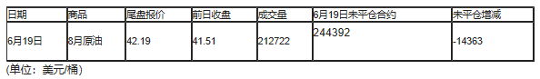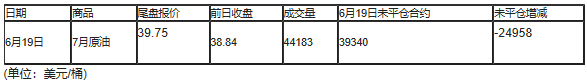 截至北京时间04:59,6月19日纽约交易所(NYX)2020年7月期原油成交量为44183,6月19日未平仓合约减少24958手。