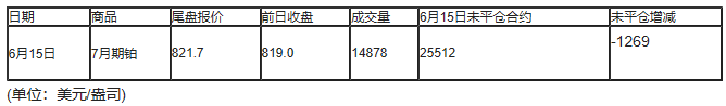 截至北京时间04:59,6月15日纽约商品交易所(NYX)2020年8月期铂成交量为14878,6月15日未平仓合约减少1269手。