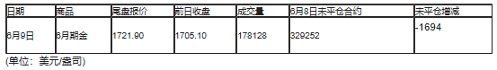 截至北京时间04:59,6月9日纽约商品交易所(COX)6月期金成交量为178128,6月9日未平仓合约减少1694手。