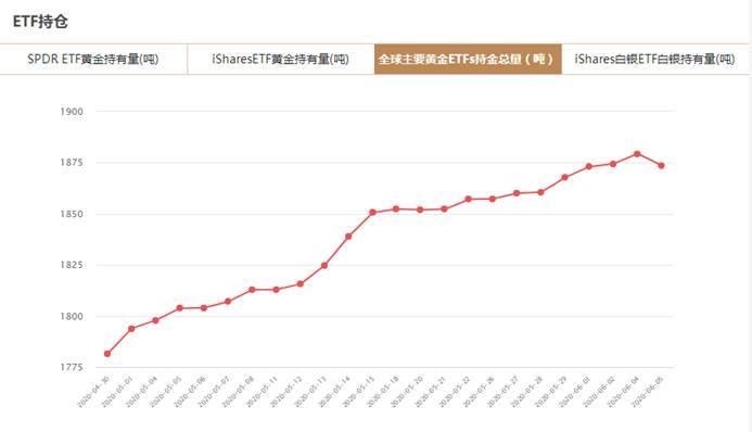 截至2020年6月5日,全球8大黄金TF持仓总量为1873.548吨,与上一交易日减少5.884吨。