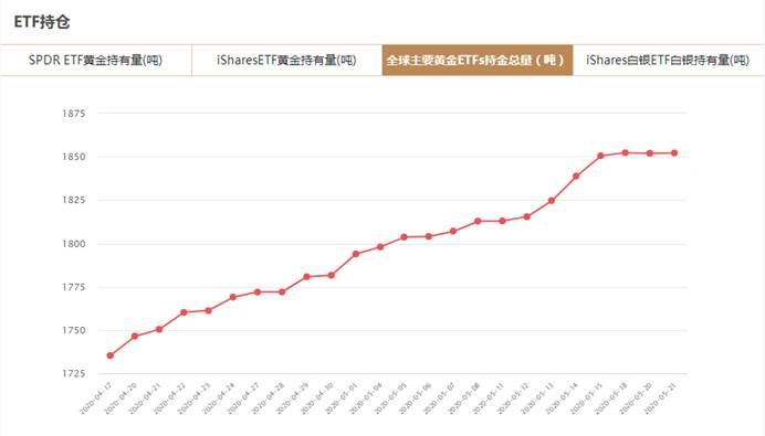 根据黄金信息网站对全球8大主要黄金TF的监控数据显示,截至2020年5月21日,全球8大黄金TF持仓总量为1852.219吨,与上一交易日增加0.3吨。