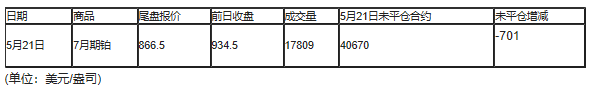 截至北京时间04:59,5月21日纽约商品交易所(NYX)2020年7月期铂成交量为17809,5月21日未平仓合约减少701手。 日期 商品 尾盘报价 前日收盘 成交量 5月21日未平仓合约 未平仓增减 5月21日 7月期