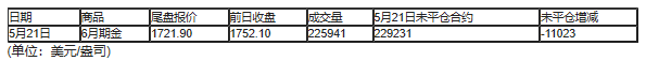 截至北京时间04:59,5月21日纽约商品交易所(COX)6月期金成交量为225941,5月21日未平仓合约减少11023手。 日期 商品 尾盘报价 前日收盘 成交量 5月21日未平仓合约 未平仓增减 5月21日 6月期金