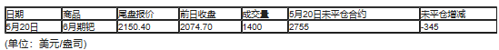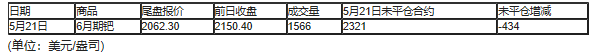 截至北京时间04:59,5月20日纽约商品交易所(COX)6月期金成交量为181448,5月20日未平仓合约减少7891手。 日期 商品 尾盘报价 前日收盘 成交量 5月20日未平仓合约 未平仓增减 5月20日 6月期金