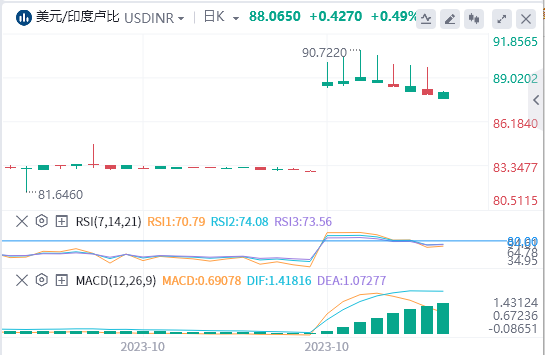 美元/印度卢比关键阻力位将处在交易区间上边界83.35附近。若突破83.35,则将反弹至年内迄今(YTD)高点83.45。进一步上行方面,美元/印度卢比下一个上行阻力位是心理整数关口84.00。