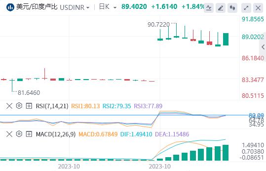 14天相对强弱指标徘徊于50附近,表明没有强烈的超买货超卖倾向,市场处于平衡状况。