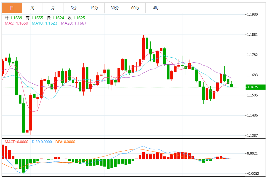 周二,欧元/美元徘徊于1.1626下方,现交投于1.1625附近,跌幅0.14%。