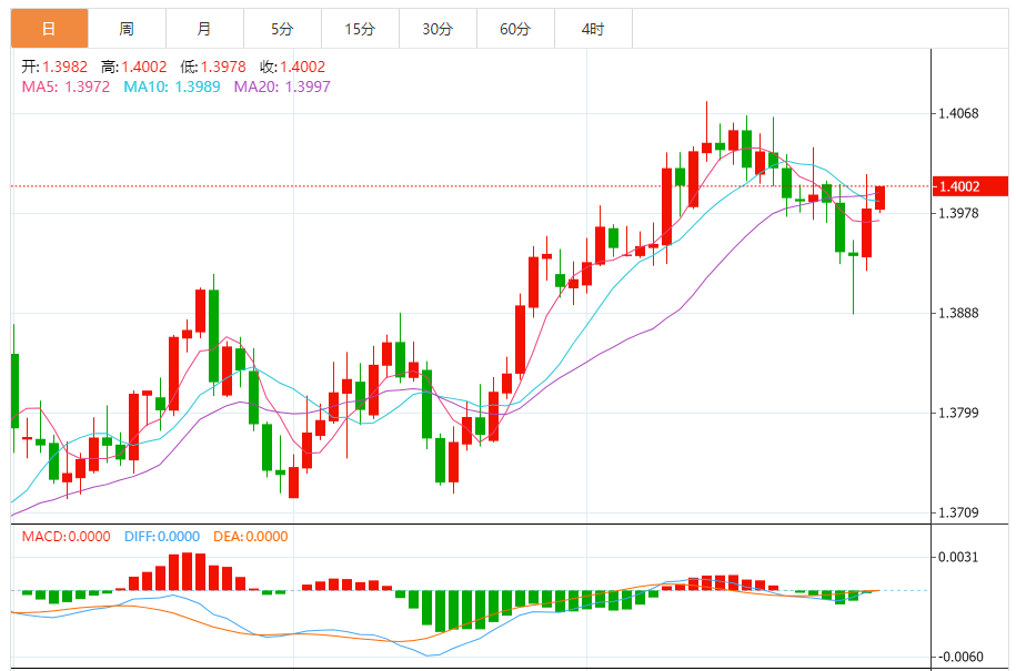 周五,美元/加元徘徊于1.4004下方,现交投于1.4002附近,涨幅0.14%。