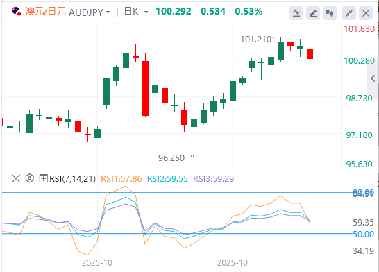 下行方面,100.00心理水平是澳元/日元的关键支撑位。在上述水平下方出现更多看跌烛台可能会将交叉盘拉回99.74,即10月29日的低点。下一个值得关注的争夺水平是97.84,即10月10日的低点。
