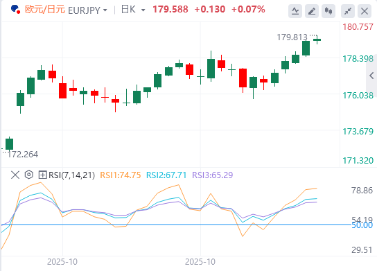 14天相对强弱指数(RSI)略低于70关口,强化了看涨倾向。然而,突破70将表明超买状况,并增加近期向下修正的可能性。欧元/日元交叉表明短期势头更强劲,升至九日指数移动平均线(EMA)上方。