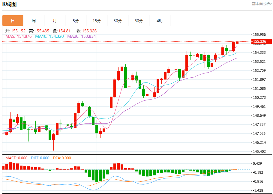 技术点评:RSI技术指标大于中性区域50。 MACD技术指标处在其信号线之上看多。 配置为正。 此外,价位高于其20天及50天移动平均线 ( 分别位于155.01 和154.79 )。