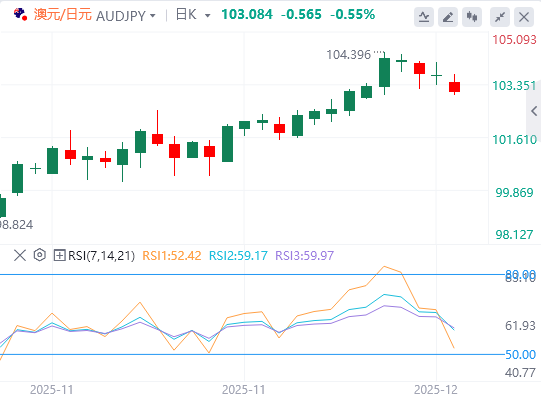 日线图中,澳元兑日元报103.15。该货币对稳守在上升的100日均线99.38上方,保持中期看涨趋势。EMA稳步上涨凸显了持续的需求。价格位于布林中线102.42上方,低于104.42上游区间,表明持续多头压力且无超延。RSI在60.04,在近期高点回落后仍高于中性50,表明动能有所降温但仍为积极。