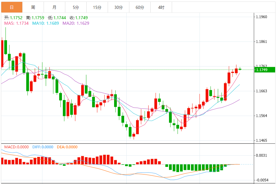 周二,欧元/美元徘徊于1.1751下方,现交投于1.1750附近,跌幅0.03%。