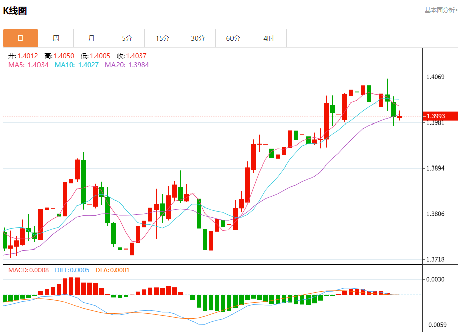 截至目前,美元/加元上涨0.01%,报1.3995。
