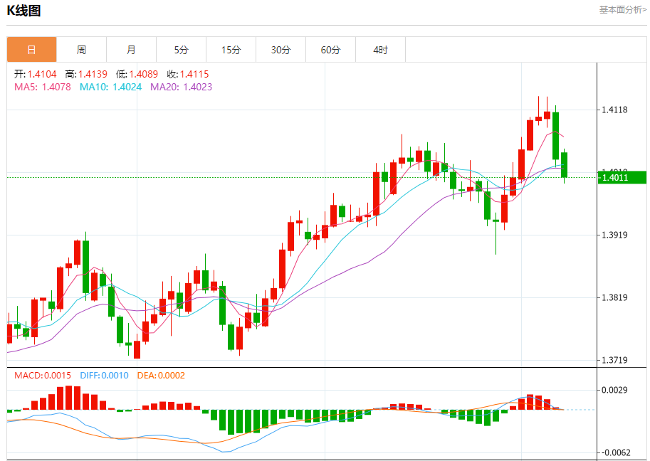 截至目前,美元/加元下跌0.20%,报1.4013。
