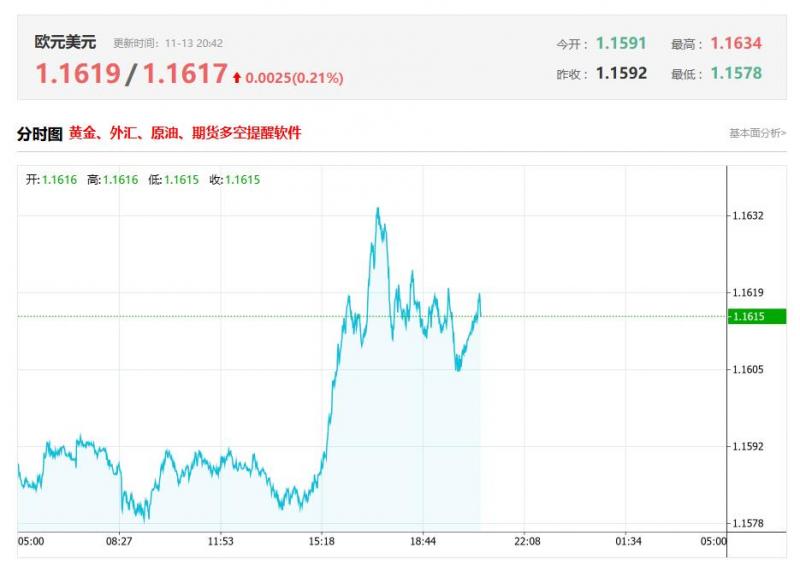 截至目前,欧元/美元上涨0.21%,报1.1617。