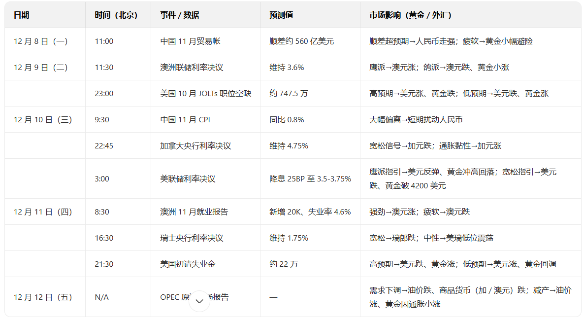 本周市场的核心博弈点是美联储利率决议,其政策指引将直接决定黄金和美元的中期走势。建议重点关注决议后的点阵图和前瞻指引。