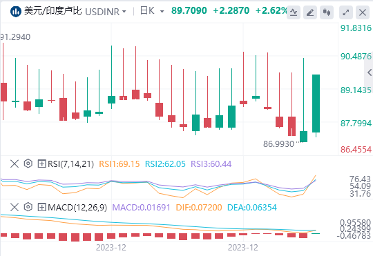 当天印度卢比交易疲软。美元/印度卢比继续在82.80-83.40的数月交易区间内波动。技术上,美元/印度卢比的最小阻力路径是上行,因为该货币对位于日线图上关键的100周期指数移动平均线(EMA)上方。上涨势头受到14日相对强弱指数(RSI)的支撑,该指数位于中点50.0上方。