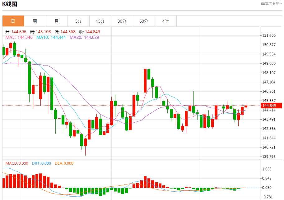 日线图显示汇价处于上行通道中,若站稳145.00,可能延续涨势;反之,若跌回144.25下方,将面临深度回调风险。