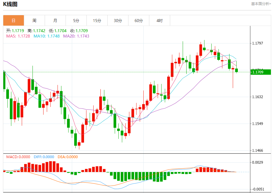 欧元兑美元已将调整幅度从1.1800高点延伸至4周低点,跌破1.1700,技术指标显示将进一步下跌。4小时相对强弱指数(RSI)接近35,移动平均收敛背离(MACD)显示红色条,显示出强烈的空头动能。