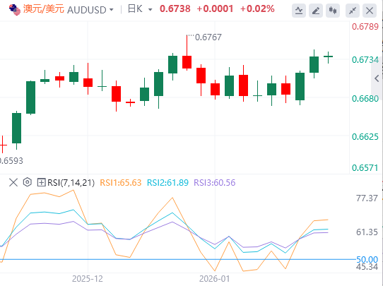 上涨方面,澳元兑美元汇率可能目标为15个月高点0.6766。近期支撑位于九日均线0.6712。若日收盘价跌破短期均线,50日均线0.6651可能成为初步支撑。进一步跌幅可能延伸至0.6414,为2025年6月以来最低水平。