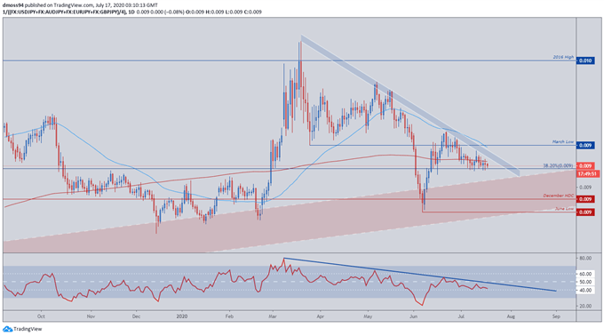 但不管怎么说,澳元/日元上行测试2019年12月的高点(76.25)仍是可能发生的。这是因为RSI仍维持着上行趋势、价格有持续朝向超买区域的趋向。日图收盘价高于7月高点可能为价格后续重新测试年度高点(76.78水平)铺平道路。