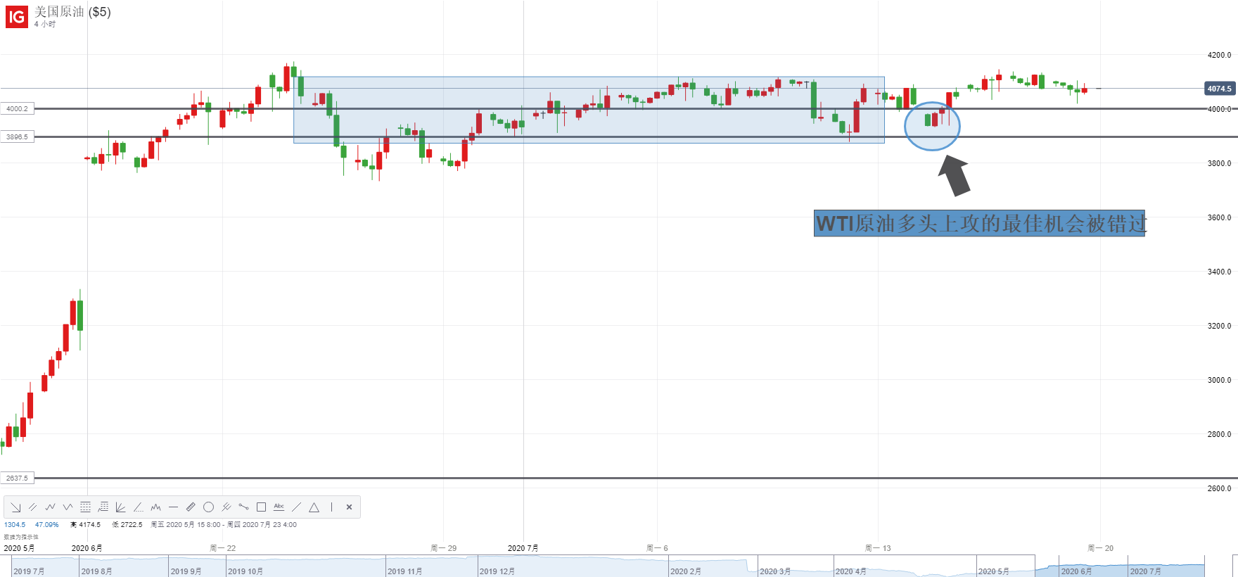 值得留意的是,目前本应处于全球原油需求复苏阶段,但原油多头却显示出上攻乏力迹象。而更为重要的是,WTI4小时图显示,油价于7月14日收复40.0美元后为上攻的最佳时机,然而多头似乎并无把握这一机会,其后油价一度上攻至41.0美元上方后辗转回落。