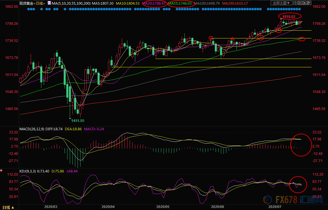 解析:全球新冠疫情形势依然非常严峻,市场担忧美国方面会重启经济封锁,这给金价提供避险支撑;而且全球央行仍普遍维持货币宽松政策,美联储也面临进一步扩大宽松政策的压力,这给金价进一步冲高提供机会;不过,此前金价在1818附近受阻后,部分多头获利了结,对金价略微有所拖累;投资者也需要提防金价震荡筑顶的可能性。