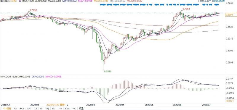 (澳元兑美元日线图)北京时间7月20日13:58,澳元兑美元报0.6989/91。