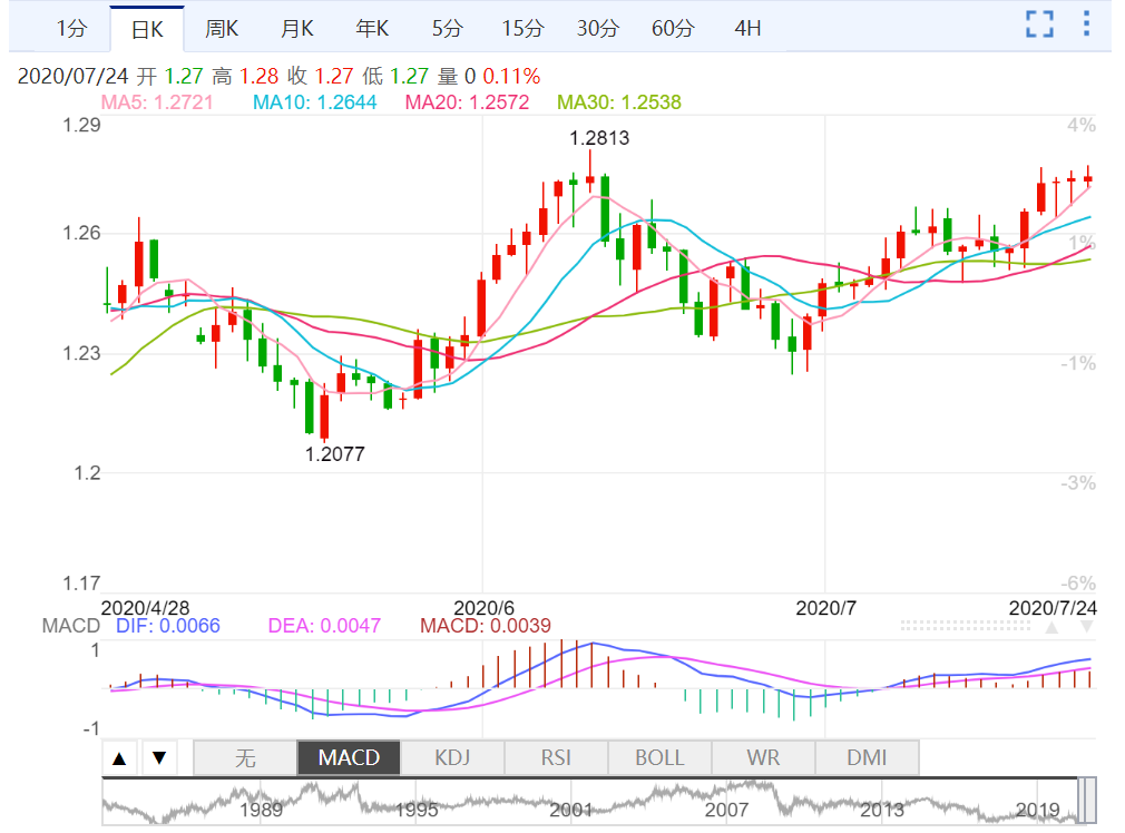 英镑:英镑/美元转而上涨,收报1.2739,涨幅0.10%。技术面上,该货币的枢轴点位于1.2724,汇价上行的初步阻力位于1.2777,进一步阻力位于1.2812,关键阻力位于1.2864;汇价下行的初步支撑位于1.2689,进一步支撑位于1.2636,更关键支撑位于1.2601。