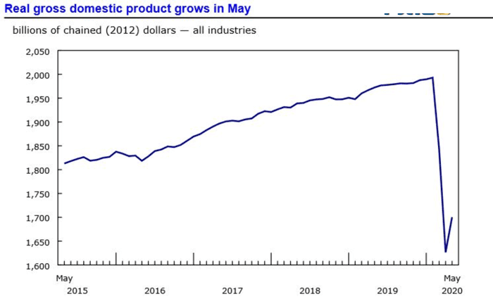 美元/加元:加拿大GDP增长超过预期,5月份增长率为4.5%,预期为3.5%。原材料和工业价格也有所上涨。美元/加币交易员无视了这则消息。这可能是因为加拿大经济要达到疫情前的水平还有很长的路要走,如下表所示。