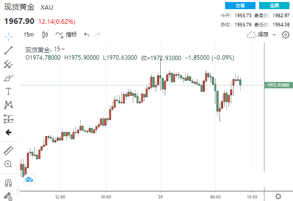 欧美时段盘中,现货金短线下跌近20美元,至1959.63美元/盎司,随后自低位反弹。