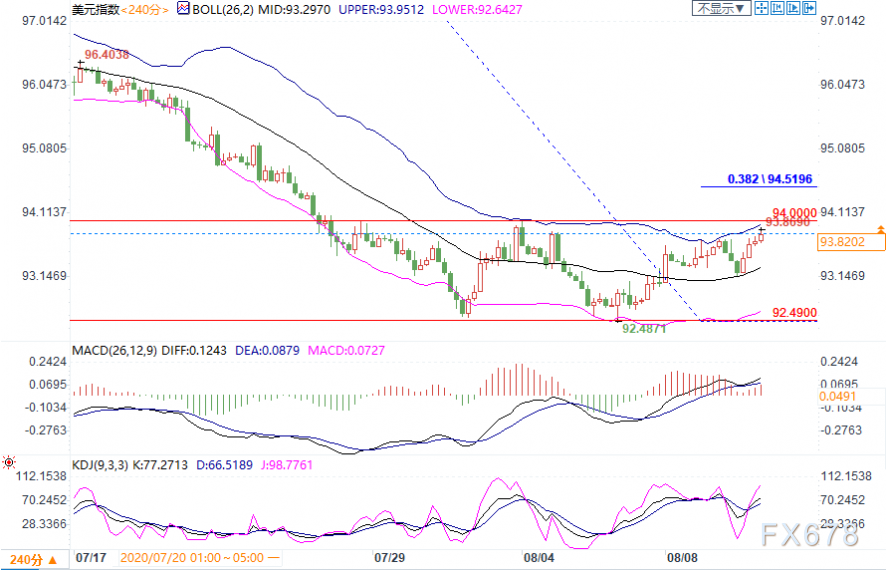 上行方面,初步阻力看向8月3日高点94.00关口,进一步阻力上看布林带中轨94.62。若进一步走高,强阻力关注6月10日低点95.70,这同时受50日均线压制,并与97.80-92.48这波跌势的61.8%回撤位相近。