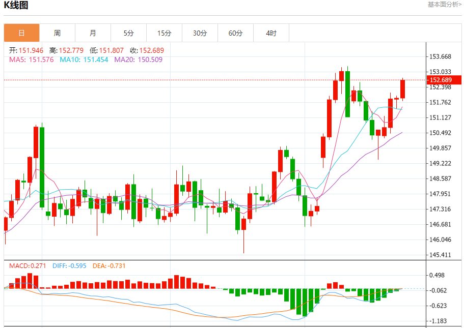 汇价高见152.788,低见151.818。上一交易日,汇价收于151.942。