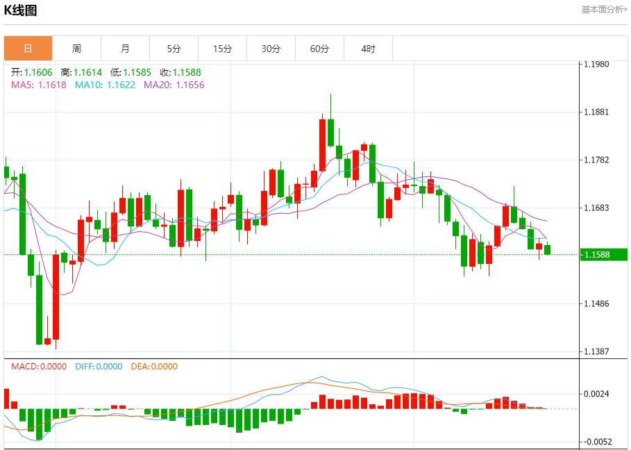 汇价高见1.1614,低见1.1585。上一交易日,汇价收于1.1609。