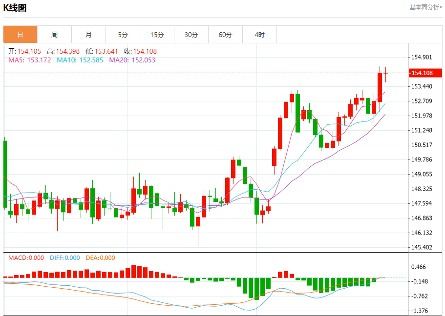 汇价高见154.409,低见153.644。上一交易日,汇价收于154.108。