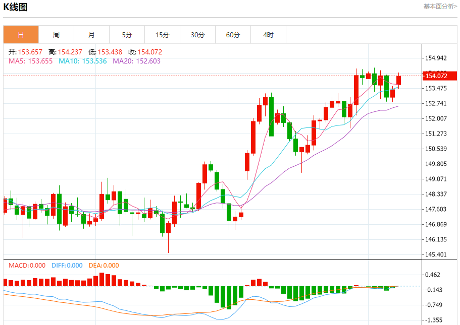汇价高见154.237,低见153.438。上一交易日,汇价收于153.407。