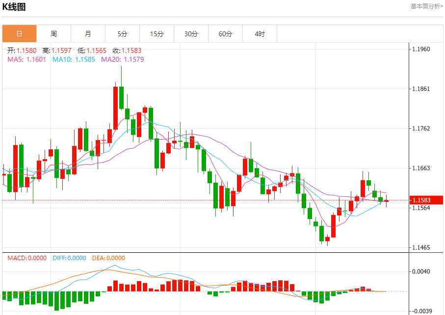 汇价高见1.1597,低见1.1565。上一交易日,汇价收于1.1580。