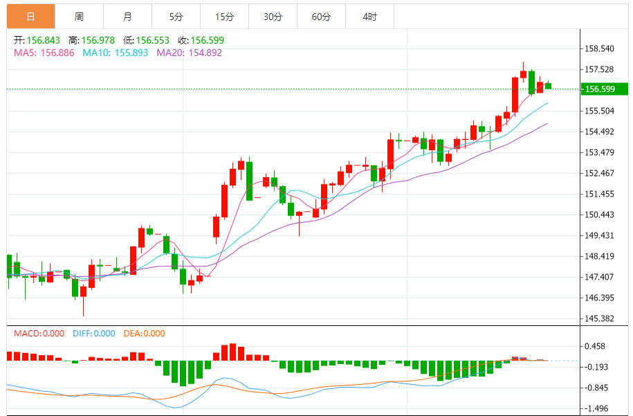 周二(11月25日),美元/日元下跌156.635,暂报156.624,跌幅0.18%。