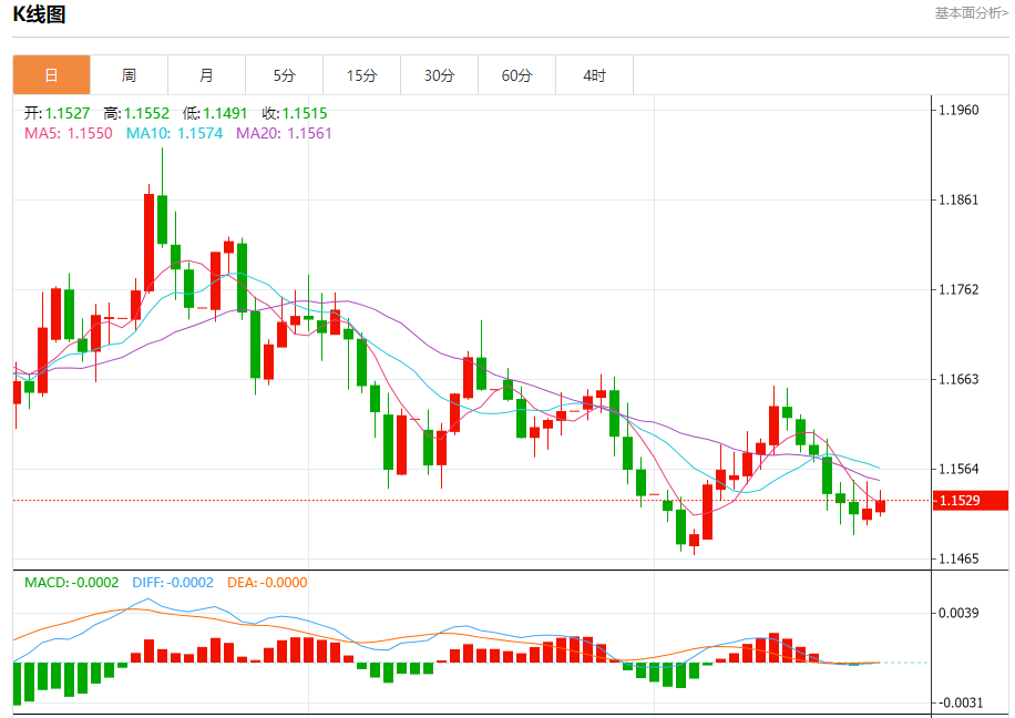 汇价高见1.1541,低见1.1511。上一交易日,汇价收于1.1520。
