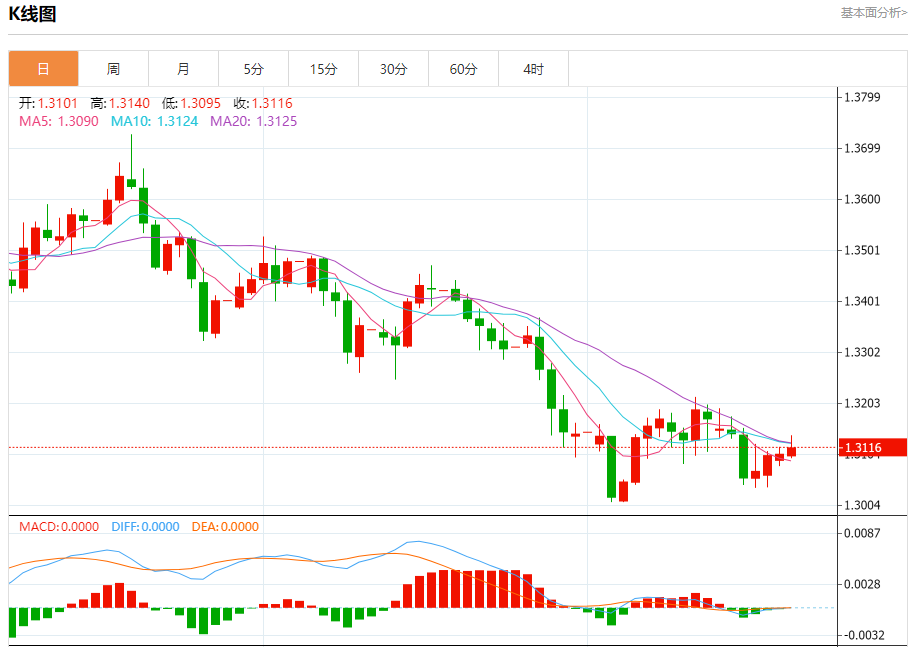 汇价高见1.3140,低见1.3095。上一交易日,汇价收于1.3104。