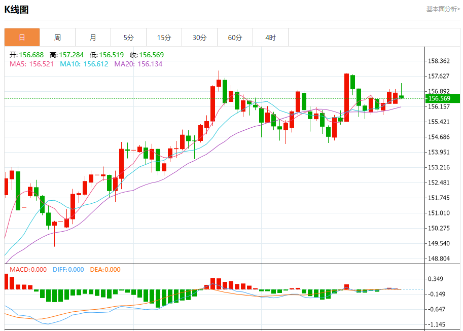 汇价高见157.284,低见156.519。上一交易日,汇价收于156.822。