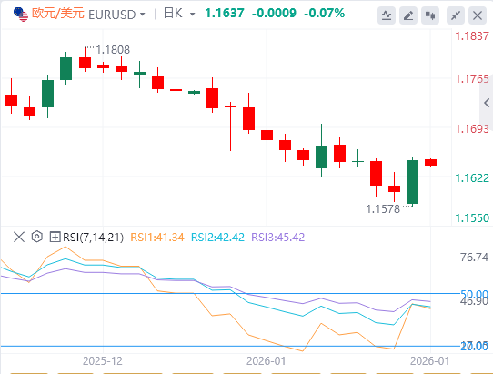 跌破九日均线和50日均线,反弹将受限,若收盘跌破12月1日创下的七周低点1.1589,将打开通往下一个支撑约1.1468的大门,该支撑为自2025年8月以来的最低。