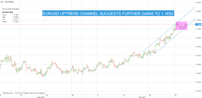 欧元/美元:欧元/美元在下午联邦公开市场委员会会议前巩固了本周的涨幅。分析人士预计,这份政策声明将与6月份的声明类似,表达对最近冠状病毒病例激增的担忧,同时对经济复苏持乐观态度。美联储在今年3月对货币政策进行了长达一年的调整,现在大家对结果都拭目以待。欧元/美元在盘中呈上升趋势,底部为1.1730点位,顶部为1.1830点位。