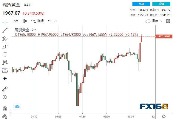 现货黄金短线一度下滑至1954.16美元/盎司,随后很快自低位拉升逾13美元,至1967.96美元/盎司。