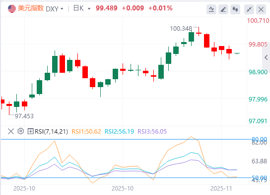 11月12日,北京时间周三亚市早盘,美元指数徘徊在99.48附近。周二,因市场担忧美国劳动力市场恶化,美元指数持续下行,并在美盘前大幅跳水,但在美盘时段收复部分失地,最终收跌0.12%,报99.48;美债因美国退伍军人节休市一日。现货黄金盘中多次逼近4150美元关口,创近三周来的新高,但未能冲上此处,反而回吐部分涨幅,最终收涨0.26%,收报4126.36美元/盎司;现货白银稳站50美元关口上方,最终收涨1.4%,报51.20美元/盎司。原油先跌后涨,WTI原油于欧盘时段开启涨势,盘中一度冲上61美元上方,最终收涨1.72%,报60.96美元/桶;布伦特原油最终收涨1.79%,报64.89美元/桶。