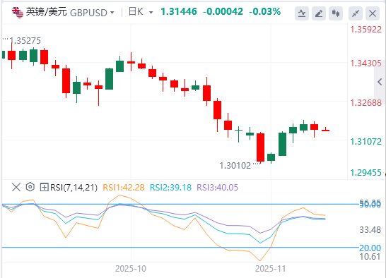 英镑:截至发稿,英镑/美元徘徊在1.3144附近。英镑/美元周二遭遇新的看跌挑战,遇到障碍并结束了连续四天的上涨。该货币对仍受阻于1.3200关口以南,英镑交易员需要新的冲击才能将英镑(GBP)的买盘推回高位。技术面上,RSI处于温和区域,因此短期内有足够的空间获得额外的动力。